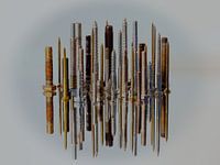 Verzameling schroeven met verschillende lengtes op een spiegel creëren een virtuele city skyline.