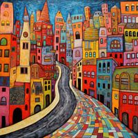 Een levendige stad vol kleur, ritme en beweging. De kronkelende straat leidt de blik door een mozaïek van vormen en warme tinten — een vrolijke ode aan stedelijke energie.