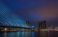Skyline van rotterdam in het blauwe uur met deel van de erasmusbrug.