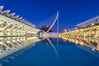 Deze foto van de door Santiago Calatrava ontworpen architectuur heb ik gemaakt in de 'City of Arts and Sciences' in Valencia. In dit gebied is prachtige moderne architectuur te vinden. De architect heeft daarnaast bijvoorbeeld het station in Luik in België ontworpen. De foto is gemaakt tijdens het blauwe uurtje op een avond in oktober 2015.