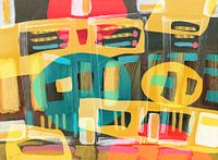Abstract schilderij van geschilderde vormen, lijnen en structuren die een interactie met elkaar aangaan.