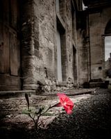 een bloemetje groeit uit de straat in een steegje in Bayeux, Normandië, Frankrijk