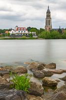 Stadsgezicht van het mooie Rhenen aan de rivier de Rijn. Op de voorgrond zijn grote keien zichtbaar waar een waterplant tussen groeit, naast het plateau van de veerpont. Op de achtergrond restaurant Moeke en natuurlijk de prachtige Cuneratoren en een mooie wolkenlucht.
