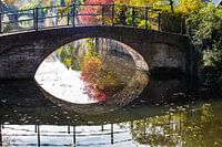 Oude brug over bijna spiegelglad kanaal omgeven door herfstkleuren