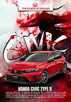 Een rode Honda Civic Type R sportwagen wordt prominent getoond tegen een dynamische achtergrond van rode en witte spetters, wat een gevoel van snelheid en energie creëert. Het gestroomlijnde ontwerp van de auto, met scherpe lijnen en een sportieve houding, wordt benadrukt door de vetgedrukte witte letters 'CIVIC' en het…