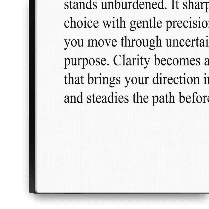 Deze minimalistische typografieposter stelt *Clarity* voor als innerlijke helderheid en bewuste focus. Het lichte ontwerp geeft de ruimte een luchtig gevoel en draagt bij aan een rustige, geconcentreerde sfeer. Perfect voor moderne woonruimtes, werkplekken of plekken voor reflectie.