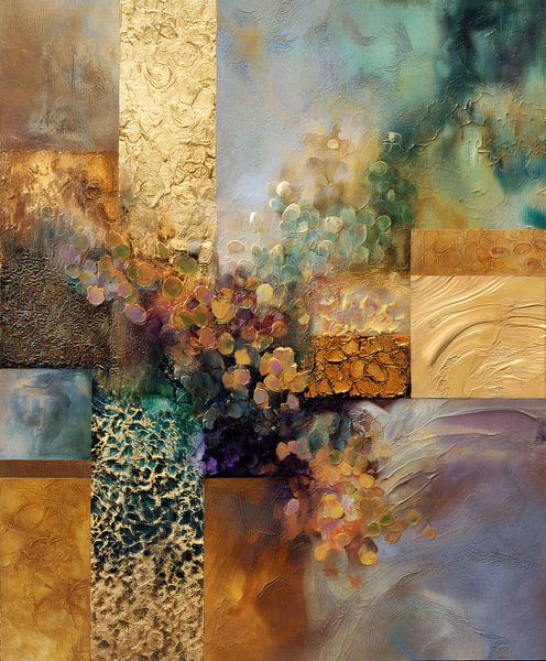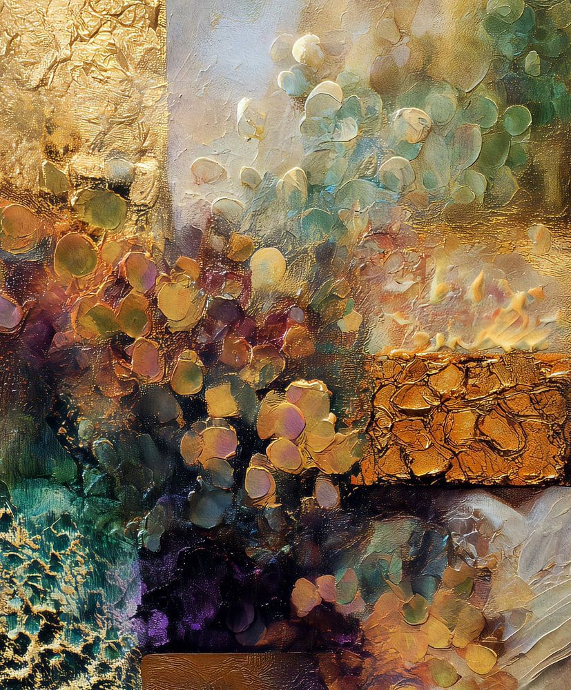 Abstracte kunst in warme aardetinten met goud accenten en verschillende grove texturen.