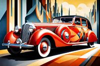 "Classic Car Reverie", een combinatie van klassieke nostalgie en moderne technologie. De felrode carrosserie en vloeiende lijnen roepen herinneringen op aan een tijdperk van elegantie en luxe, terwijl de abstracte vormen en warme kleuren op de achtergrond een gevoel van moderne dynamiek toevoegen. Elementen van melancholie en romantiek…
