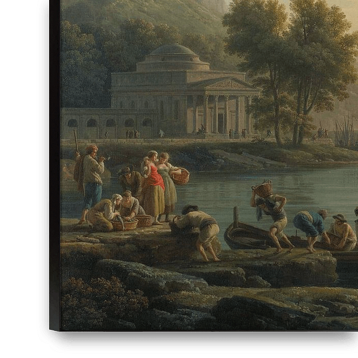 Koop Claude-Joseph Vernet,Een landschap bij zonsondergang als reproductie geprint op canvas, aluminium dibond, (ingelijste) fotoprint, behang en ArtFrame. Voor jou op maat geprint in Fine-Art kwaliteit.