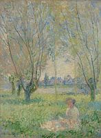 Een dame zit in haar witte jurk in het gras, tussen de knotwilgen in een landschap. Op de achtergrond water met de skyline van een stad.