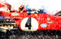 Illustratie van een serie legendarische Formule 1-racers en hun coureurs. Ontworpen uit liefde voor het klassieke racen. Geschilderd met aquarellen op papier.