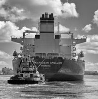 Het schip Clearocean wordt met behulp van 2 sleepboten, één voor en één achter, naar de Amsterdamse haven geloodst. Het werk os geschoten vanaf de veerpont en de fotograaf de gelegenheid gaf om de fraaie shot te maken. De witte wolken en de zwart-wit uitvoering geven het werk een stoer uiterlijk.