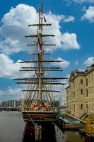 Een stoer beeld van een stoer zeilschip dat afgemeerd ligt voor het Scheepvaartsmuseum in Amsterdam.