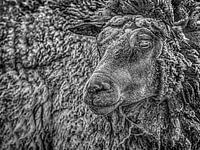 Close-up portret van een wollig schaap in zwart-wit in de periode vlak voordat het geschoren wordt waardoor een weelderige begroeiing heeft.