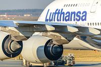 Deze Airbus A380-800 van Lufthansa wordt naar een parkeerplaats gesleept op de luchthaven van Frankfurt am Main.