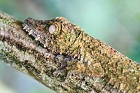 Prachtige close up macro van de extreem goed gecamoufleerde Madagaskarplatstaartgekko (Uroplatus fimbriatus) op het eiland Madagaskar in de jungle van Nosy Mangabe