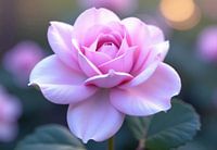 Close-up van een enkele lichtroze roos met delicate bloemblaadjes, in soft focus met onscherpe achtergrond van groen gebladerte en onscherpe rozenknoppen.