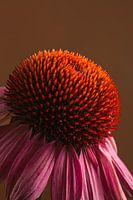 "Close-up in warme kleuren: Het hart van een Echinacea" is een macrofoto van het hart van een Echinacea. In Nederland wordt deze plant ook wel Zonnehoedje genoemd. Ze zijn er in vele verschillende kleuren, maar deze heeft een prachtige warme oranje rood bruin hart, met daaromheen roze bloemblaadjes. De achtergrondkleur is bijna egaal en heeft ook een warme kleur.