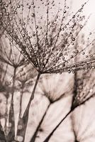 "Close-up morgenster zwart-wit met bruin / sepia " is een macrofoto van een klein deel van een morgenster, die gefotografeerd is met o.a. tegenlicht. Aan de morgenster hangen kleine waterdruppeltjes.