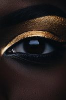 Deze opvallende close-up foto vangt de betoverende blik van een oog, omlijst door een opvallende metallic gouden oogschaduw en diepzwarte eyeliner. Het contrast tussen het glanzende goud en het donker omlijnde oog zorgt voor een luxueuze en mysterieuze uitstraling. De intense focus en de fijn gedetailleerde textuur benadrukken de schoonheid en kunstzinnigheid van moderne make-up. Perfect als statement piece in elke ruimte waar je een vleugje verfijning en glamour wilt toevoegen. Dit werk spreekt liefhebbers van fashion, schoonheid en hyperrealistische kunst aan en is ideaal voor een slaapkamer of kantoorruimte.