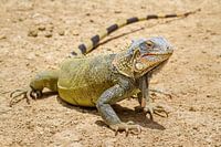 Portret van groene leguaan op de grond. De foto toont het reptiel in zijn geheel. Dit dier heb ik op het eiland Bonaire gefotografeerd. De dieren lopen daar in de vrije natuur en soms komen ze nieuwsgierig op de toeristen af als die voer bij zich hebben. Ze kunnen wel anderhalve meter lang worden!
