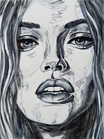 Aquarel van een vrouw in zwart wit. Indringend, van dichtbij geschilderd. Aquarel in zwart wit, dichtbij lijntekening. Volle lippen met prachtige tanden. Schilder expressionisme landelijk sober. Emotie. Prachtig neergezet met eenvoudige penseelstreken, minimalistisch. Less is more. Mooie vrouw met emotie in haar ogen, verleidelijk. Modern Abstract.