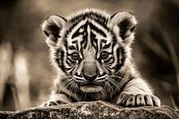 Deze prachtige foto toont een aandoenlijke tijgerwelp in een subtiele sepia-stijl. De intense blik van het dier, gecombineerd met de fijne details van de vacht en de zachte kleuren, maakt dit ontwerp een perfecte keuze voor een stijlvolle interieurdecoratie. Het design straalt kracht en elegantie uit en voegt een tijdloos karakter toe aan elke ruimte. Perfect als wanddecoratie voor dierenliefhebbers of iedereen die van natuur en kunst houdt.