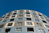 Close up van De Peperklip, een mooi appartementengebouw in Rotterdam. Diverse kleuren, in een simpel patroon, maar het geeft toch een erg strak geheel.