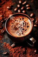 Een dampende mok aromatische koffie, omringd door koffiebonen en fijn cacaopoeder, wekt de zintuigen en creëert een uitnodigende sfeer. Het warme, donkere kleurenpalet brengt gezelligheid en genot in elke hoek. Ideaal voor in de keuken of eetkamer, waar de dag kan beginnen met een rijke koffie vol mogelijkheden.