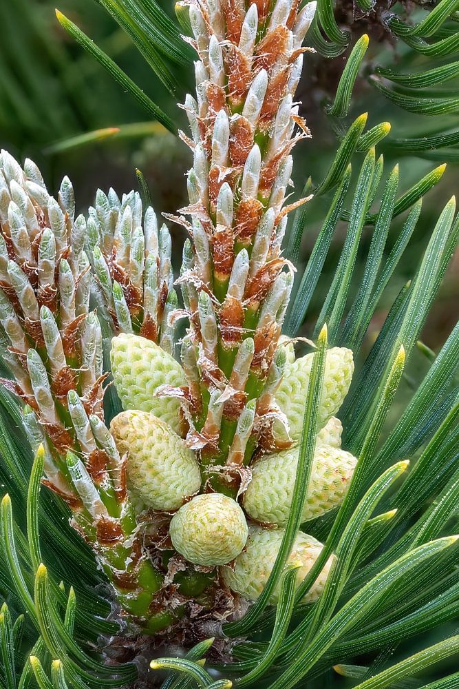 Close-up van bloemen van de kreupelhoutden, Pinus pumila, met stuifmeel en dennennaalden in het voorjaar