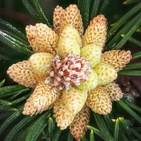 Close-up van bloemen van de kreupelhoutden, Pinus pumila, met stuifmeel en dennennaalden in het voorjaar