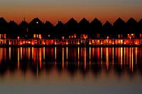 De gekleurde huizen aan de recreatieplas De Rietplas in Houten-Zuid met ervoor de fietsbrug. De lichten van de huizen en de fietsbrug weerspiegelen in het water van de plas.