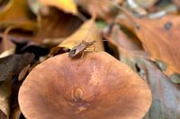 Close-up van de smalle randwants, Gonocerus acuteangulatus, poserend op een paddenstoel