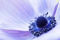 Close-up van een Anemone Coronaria "Mr Fokker" . Gemaakt op de Keukenhof. De onscherpte in de bladeren zorgt voor zachtheid. De donkere stampers staan in mooi contrast met de lichte blaadjes.