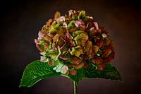 De close-up van de bloem van een hortensia in een studiofoto. De foto is belicht als het licht in een klassiek schilderij om het effect van een stilleven te versterken en waardoor de details van de bloem tot hun recht komen.