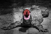 Komodovaraan kijkt confronterend recht in de camera. Zwart wit versie met gekleurde bek.