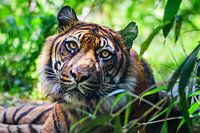 Op deze foto de tijger aan het rusten in een omgeving met veel groen wat een mooie achtergrond vormt.