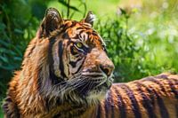 Close-up van een Sumatraanse tijger - een bedreigde diersoort. Deze foto is van dichtbij genomen, de details van de tijger zijn goed te zien.