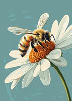 Deze foto toont een gedetailleerde close-up van een bij die op een witte madeliefjesbloem zit. De bij is geschilderd in warme gele en bruine tinten en verzamelt nectar uit het feloranje hart van de bloem. De textuur van de bloemblaadjes en de fijne details van de vleugels steken af tegen de zachte, blauwgrijze achtergrond, waardoor de foto een harmonieuze en natuurlijke uitstraling krijgt.