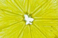 Close-up van een citroen schijfje met een witte achtergrond en veel structuur.