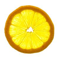 Close-up van een citroen schijfje met een witte achtergrond en veel structuur.