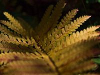 Close-up van een geel verkleurd varenblad in het Zwarte Woud met selectieve focus en bokeh.