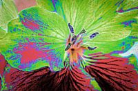 Close up van een geranium, digitaal bewerkt zodat er een geheel nieuw beeld ontstaat, andere kleuren en belichting maar dezelfde vormen. Je kunt er de bloem nog in herkennen maar het beeld is abstract geworden.
