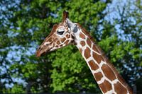 Beeld van een giraf op een zonnige dag, tegen een groene achtergrond.