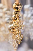Volledig scherm close-up van een glamoureuze gouden ketting met witte diamanten, selecteer nadruk en vage achtergrond.