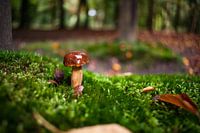 Bruine paddestoel tussen het groene mos met glanzende zwam. Op de achtergrond een herfstachtig bos met stralend najaars licht, herfstkleuren en bladeren