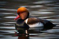 Mooie kleurrijke eend in het water. Vanwege de grote rood-oranje voorhoofd word deze eend krooneend genoemd. Opvallend is ook de knalrode snavel.