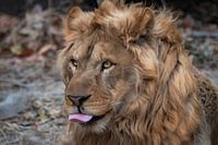 Portret van een mannetjes leeuw die zijn tong uitsteekt.