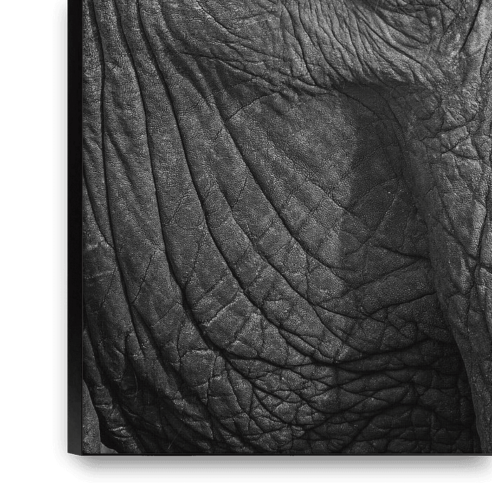 Een close-up vangt de ingewikkelde rimpels en ruwe huid van een olifant, met nadruk op het oog van het dier en de texturen eromheen. De zwart-wit tinten benadrukken het contrast en de details, waardoor een opvallende weergave van de kenmerken van de olifant ontstaat.