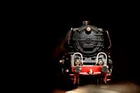 Close-up, macrofoto, van een oude en verstofte stoere speelgoed stoomtrein. Het is een speelgoedtrein, maat HO, en van het merk Märklin.